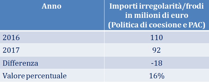 A livello nazionale, le numerose iniziative promosse dal Comitato per favorire con maggiore efficacia la fase di prevenzione dei fenomeni di frode e irregolarità hanno prodotto un decremento del cosiddetto 'tasso d'errore' nell'utilizzo dei fondi europei (Fondi strutturali e Politica Agricola Comune) che conferma una tendenza registrata già negli anni precedenti. Nel 2017, la diminuzione degli importi relativi ai casi di irregolarità/frode si è attestata al 16% che, in termini assoluti, equivale a 18 milioni di euro rispetto alla precedente annualità.