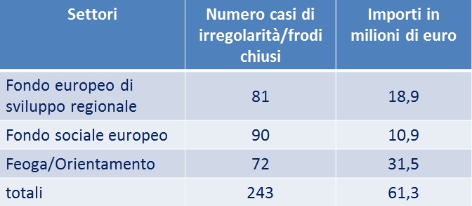 E' proseguita anche l'attività di chiusura, avviata nel 2014, dei casi di irregolarità/frode più datati ancora aperti con la Commissione europea. Tale attività ha consentito la chiusura di 243 casi per un importo complessivo di oltre 61 milioni di euro, evitando che tale importo venisse rimborsato alla Commissione europea con un notevole risparmio per il bilancio nazionale.