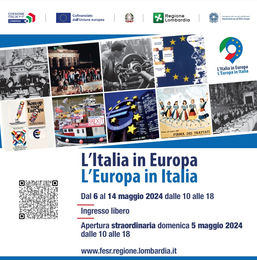 La mostra "L'Italia in Europa, l'Europa in Italia", viene esposta dal 6 al 14 maggio 2024 a Palazzo Lombardia, con apertura straordinaria domenica 5 maggio in occasione del Belvedere Experience, l'accesso al Belvedere del 39º piano di Palazzo Lombardia, un'occasione per ammirare il panorama di Milano.