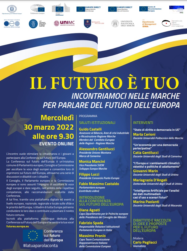 Mercoledì 30 marzo 2022 si svolge l'evento online "Il futuro è tuo - Incontriamoci nelle Marche per parlare del futuro dell'Europa".