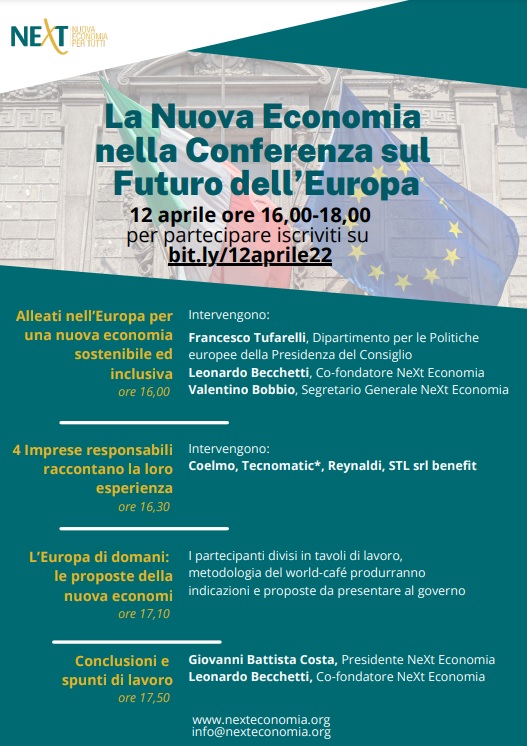 "La Nuova Economia nella Conferenza sul futuro dell’Europa" è il titolo dell'evento online organizzato il 12 aprile 2022 da NeXt Nuova Economia per Tutti, rete di associazioni della società civile che intende promuovere e contribuire a realizzare un nuovo modello economico più sostenibile, partecipato e accessibile a tutti.